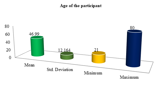 In this study, researcher shows that the mean age of the participant was 46.99 years (SD±12.164). The respondents age of participant minimum 21 years and maximum 80 years. The range of years 59 (Figure 1).