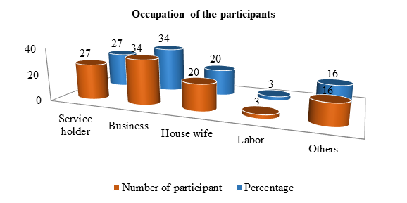 This figure illustrated that among the participants business were the highest rate that was about 34% (n=34). Service holder participants were second uppermost rate that was 27% (n=27). House wife participants were 20% (n= 20), others participants were 16% (n=16) and labor were less participant 3% (n=3) (Figure 2).