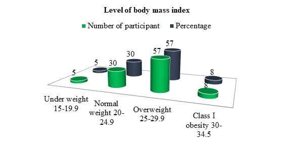 Study found that preponderance cases 57% participants were overweight BMI whereas 8% respondents were class I obesity (Figure 3) and 5% underweight also be 30% normal weight.