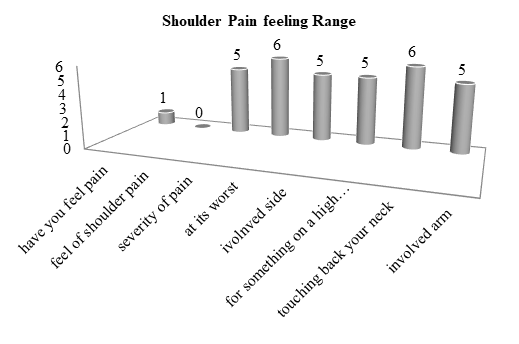 Study showed to facilitate, patient feel pain was at 1, severity of pain score 5, worst pain score 6, involved score 5, accomplishment for incredible on a high shelf score 6 and touching back your neck score 5 questionnaire is more pain in shoulder (Figure 4).
