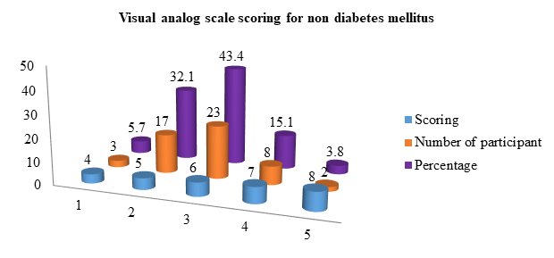 Study show that, total 53 persons of non diabetes mellitus for visual analog scoring were highest scoring of moderate pain that was level 6 with 23 person, mild pain 17 person of level 5 and lowest scorning 2 person in the level of 8 in worst pain (Figure 5.1).