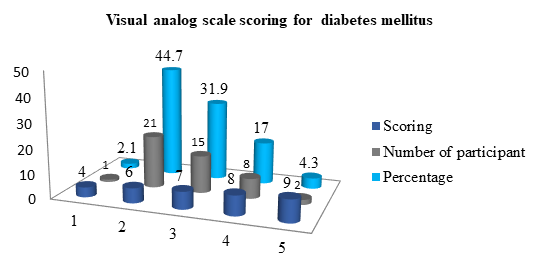 Study show that, total 47 persons of diabetes mellitus for visual analog scoring were highest scoring of moderate pain that was level 6 with 21 person, second scoring of 15 person at the level of 7 and lowest scoring 2 person in the level of 9 in worst pain (Figure 5.2).