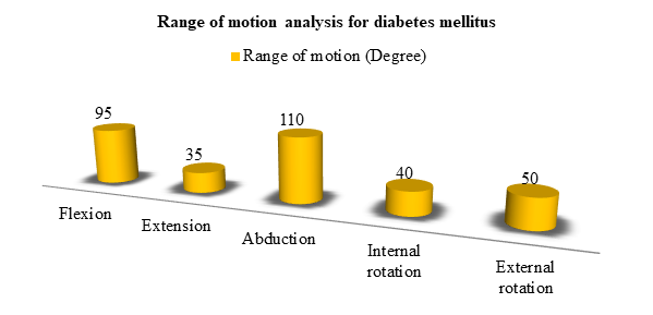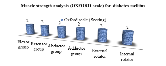 Study found that for diabetes mellitus patient’s flexor strength of the shoulder here statistical scoring 2. Extensor strength of the shoulder range scoring 2, abductor strength of the analysis scoring 2. Adductor of the shoulder range scoring 2, internal rotator of the shoulder strength analysis minimum scoring 2 and external rotator of the shoulder strength analysis scoring 2 in Figure 7.2 showed.