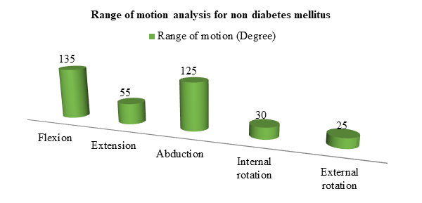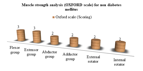 Study found that for non diabetes mellitus patient’s flexor strength of the shoulder at this point statistical scoring 3. Extensor strength of the shoulder range scoring 3, abductor strength of the analysis scoring 2. Adductor of the shoulder range scoring 2, internal rotator of the shoulder strength analysis minimum scoring 2 and external rotator of the shoulder strength analysis scoring 2 in Figure 7.1 showed.