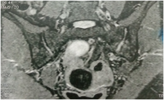 Figure 1 widening of left SIJ space on coronal fat suppression T2 with high signal intensity denoting pus more on the left side joint.