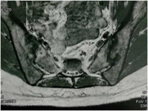 Figure 2 left SIJ showing low signal intensity (edema and suppuration) and irregular joint outline (denoting destruction) on T1 MRI.