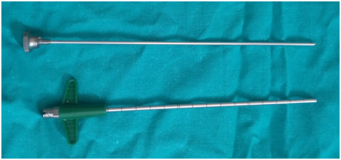 The drainage procedure was performed in the operative theatre using local infiltration anesthesia from skin down to bone and under conscious sedation. Patients were positioned in the supine position over the orthopedic table allowing C-arm use in both anterior and lateral projections.