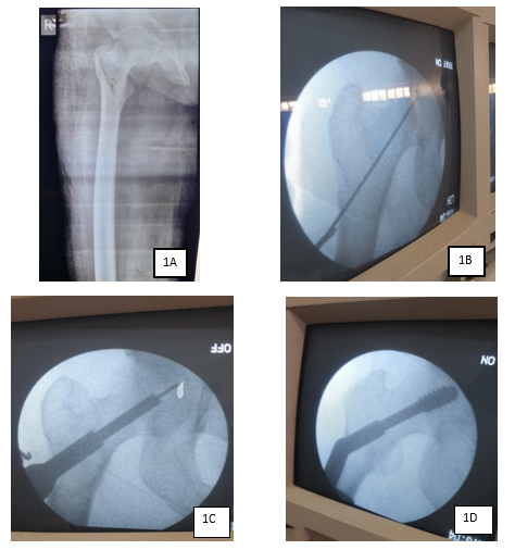 Figure 1 60 year old woman presented with 1 week history of fall, sustained right intertrochanteric fracture (1A). Intraoperative pictures showing inserted guide wire (1B), triple reaming (1C) and final DHS fixation (1D).