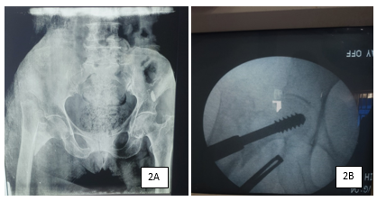 The patient was positioned supine on a traction table and was given either spinal or general anaesthesia. All patients had a single injection of prophylactic 3rd generation Cephalosporin 30 minutes before skin incision as per unit protocol. The fracture was first reduced using image intensification guidance, with the use of traction and slight internal rotation. The presence of smooth medial and anterior cortical bony buttressing on the image indicates satisfactory reduction. An attempt was made to avoid varus mal-alignment of the neck-shaft angle. For patients with late presentation or fracture that could not be reduced using the closed reduction method, the fracture was reduced after opening the fracture site through a lateral approach to the proximal thigh. When the bone was reached and exposed, a guide wire was inserted parallel to the neck after making a small drilled hole which was advanced until the required position and tip-apex distance were obtained (Figure 1B). The pathway of the guide wire was drilled using a DHS triple reamer which was adjusted to the rough length of the DHS screw to be used (Figure 1C). At this stage, tapping may not be necessary, especially in osteoporotic bones. The required screw length (usually 60-95mm) was mounted on the T handle and driven to the appropriate position in the femoral head with the use of intraoperative image guidance (Figure 1D & 2B). The 1350 (4 to 8 holes) DHS side plate was fixed to the screw and a minimum of 2 cortical screws were used to hold the plate in place. Following this, the longitudinal traction was released before the final locking of the locking screw which prevents proximal fragment rotation and further reduced the fracture gap for more stability. Stability was tested by a hip range of motion followed by layered wound closure. In cases of delayed presentation and failure to achieve closed reduction, the fracture site has to be open first to release any fibrous tissue and callus to achieve desirable fracture reduction. This may cause more bleeding and prolong operation time compared to cases with early presentation.