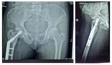 At the immediate postoperative period, graded weight-bearing was allowed as pain was tolerated. Patients were followed up after the average 5 days of the postoperative period at 6 weeks, 12 weeks, 6 months and 1 year in the outpatient clinic. During the follow-up times, anteroposterior and lateral view radiographs of the operated areas were taken, and findings including any associated complications were noted (Figure 3). Additionally, functional outcomes were assessed and Parker's mobility scores were recorded (12). This score was assessed in all our patients both preoperatively and postoperatively and takes into account the patient’s ability to independently walk with a maximum score of 9 to the lower score with needs for support and lowest score of 0 in completely non-ambulant patients.