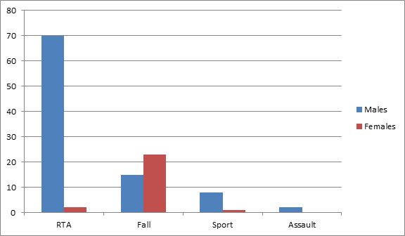 In this study, hip fracture was more common among the age range 51 to 70 years with 47(39%), followed by 31 to 50 years with 32(26%). This may be explained by the combined factors of RTA, fall and fragility among the older patients. The same fracture type occurring in different gender groups may result from different injury mechanisms. Predominantly, RTA was the cause of the fracture in 70 (58%) male patients meanwhile simple fall was the predominant cause in 23(19%) female patients, and this number constituted 88% of female patients in the study (Figure 3). Osteoporotic elderly women are susceptible to proximal femoral fracture especially the intertrochanteric type following trivial falls. This is the same as what has been reported by many researchers on data related to intertrochanteric fractures and elderly women.21 Although we used the DHS device on this group of patients, our selection was based on the presence of reasonable bone stock and the absence of hip osteoarthritis warranting hip arthroplasty. Subtrochanteric fractures are also amenable to surgical fixation by use of DHS device, this is usually in the form of dynamic condylar screw (DCS) fixation.22 The low number of patients with subtrochanteric fractures in our study (11/9%) was attributed to treatment of this fracture type by other fixation methods, particularly by extramedullary device as reported by Xie H et al. in their systemic review and meta-analysis of 11 studies recommended intramedullary device as treatment of choice for subtrochanteric fractures following their findings of shorter operation time, less intraoperative blood loss, shorter length of incision, length of stay and better functional outcomes in subtrochanteric fractures with intramedullary fixation than the ones with extramedullary fixations.23