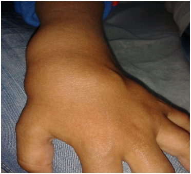 Revealed a well looking boy with normal growth parameters, maculopapular skin eruptions in trunk and extremity, diffuse swelling in the wrists, ankles, knees and proximal inter phalangeal joints of all fingers of both hands. There is tenderness and palpable multiple cystic swelling on the dorsal surface of both wrists and ankles.