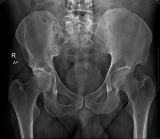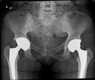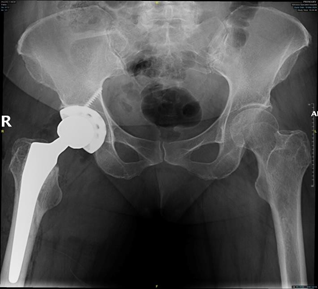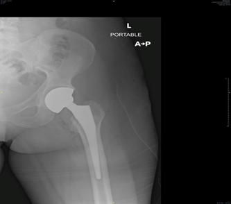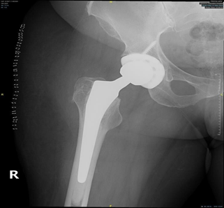 Harris Hip Score (HHS) was used for assessment of the functional outcomes. Follow up has been done to all patients after 6 weeks and then after 6 months to determine functional outcomes by clinical examination and by X-rays. Xrays were checked for any evidence of implant loosening, dislocation, or heterotopic ossification. Patients were seen by a hematology doctors and the study authors at every follow-up visits, and we documented medical and surgical complications. Failure was defined as the need for redo hip replacement surgery due to infection, dislocation, loosening, or surgical complications (Figure 5).