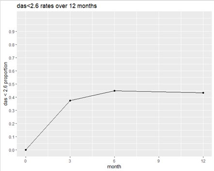 To examine the probability of clinical remission over time, defined as DAS28-ESR <2.6, a Hierarchical Linear Regression model was used for dichotomous dependent variables (Raudenbush and Bryk, 2002). To model the behavior of the dependent variable, a bilinear (bi-spline) model was used with a cut-off point at 6 months. Therefore, two linear slopes were examined for the probability of remission, one from the start of TOF treatment until month 6 and another from month 6 to month 12. The independent variables evaluated were gender, age, disease duration at entry into the study from diagnosis, structural joint radiological damage, previous MTX and bDMARD use and baseline DAS28-ESR. In all cases a p value < 0.05 was considered indicative of statistical significance. STATA 14.1 (StataCorp, Texas, USA) was used for the statistical analysis. Multivariate analysis were performed using R software and its library packages (Lme4, Tidyverse and ggpubr).