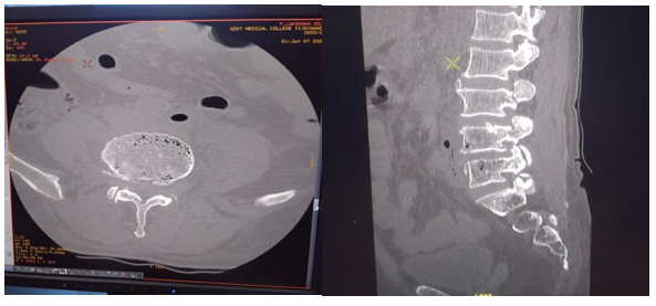 He got a plain radiograph of the thoracolumbar spine and was within normal limit. On CT scan (Figure 1), multiple air pockets were noted in L4 & L5 vertebrae.