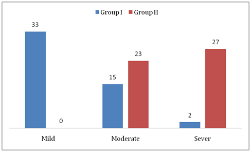 The results of Pain score in group I was: 33 (66%) patients shows mild pain, 15 (30%) patients shows moderate pain and only 2 (4%) patients shows sever pain. In group II: 0% patient’s shows mild pain, 23 (46%) patients’ shows moderate pain and 27 (54%) patients shows sever pain. Table (1), Figure (1) VAS for pain was 3.7+2.1 in group I and 6.5+1.8 in group II.