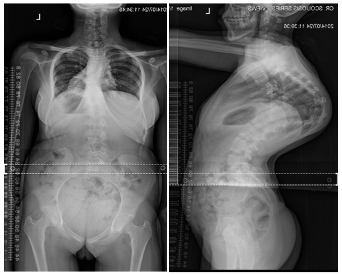 Antero-Posterior and lateral view radiographs showed a severe thoracic kyphosis of 135° from T7-T12 and a lumbar lordosis of 111° (Figure 4 & 5).
