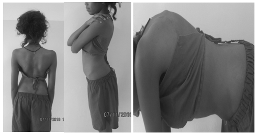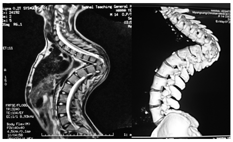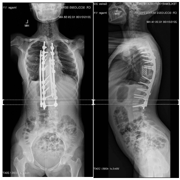 A 15-year old female had a 3-year history of recurrent episodes of dry cough associated with low-grade fever, shortly followed by upper back moderate pain, and a hump on her back (Figure 1-3). She had been given chemotherapy for tuberculosis over a period of 6 months. There was resolution of the pulmonary TB but the spine deformity progressively worsened over time. She had been experiencing worsening episodes of shortness of breath at rest. Her initial Body Mass Index (BMI) was 18.2kg/m2, and improved to 19.4kg/m2 after a 4-month period of nutritional optimization and Halo Gravity traction. She was neurologically intact.