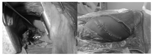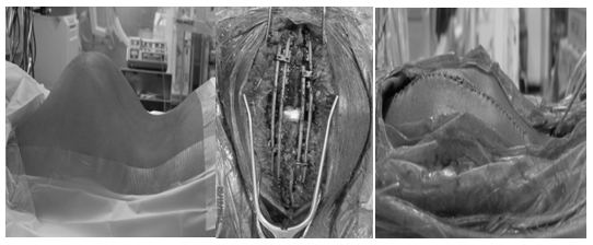 Halo gravity traction was maintained over a 4 month period with resultant improvement in curve magnitude from 135° to 119° and a lumbar lordosis from 111° to 94°. Surgical treatment consisted of posterior fusion, vertebral column resection of the 9th and 10th thoracic vertebrae, with posterior segmental spinal instrumentation from the 3rd thoracic vertebra to the 3rd Lumbar vertebra and an interbody cage inserted at the site of the resection (Figure 8-10). The estimated blood loss for the entire procedure, which lasted for 360minutes, was 1,100mls. The surgery was performed with sensory and motor neuro-monitoring and there was no intraoperative neuro monitoring changes during the whole procedure. We maintained a mean arterial blood pressure of 70 to 80 mmHg and also gave pre op and intraoperative infusion of tranexamic acid.