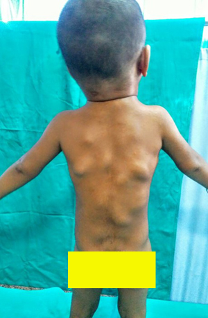 Figure 2 Multiple bony mobile swellings on occiput, nape of neck, bilateral scapulae, posterior axillary folds & thoracolumbar area.