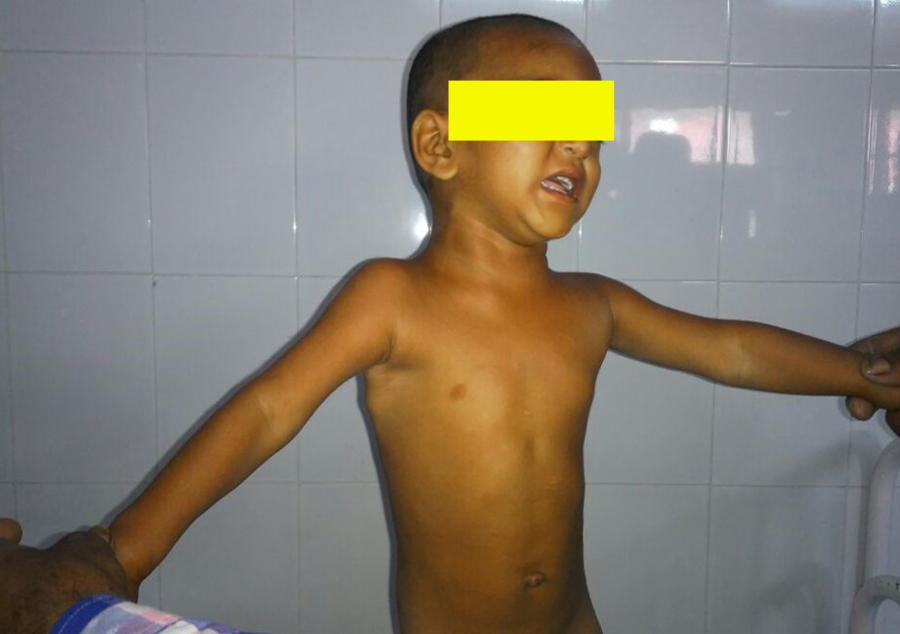Figure 3 Decreased range of motion of shoulders (right > left). Any passive attempt on moving shoulders, was painful as evidence by facial expression of patient.