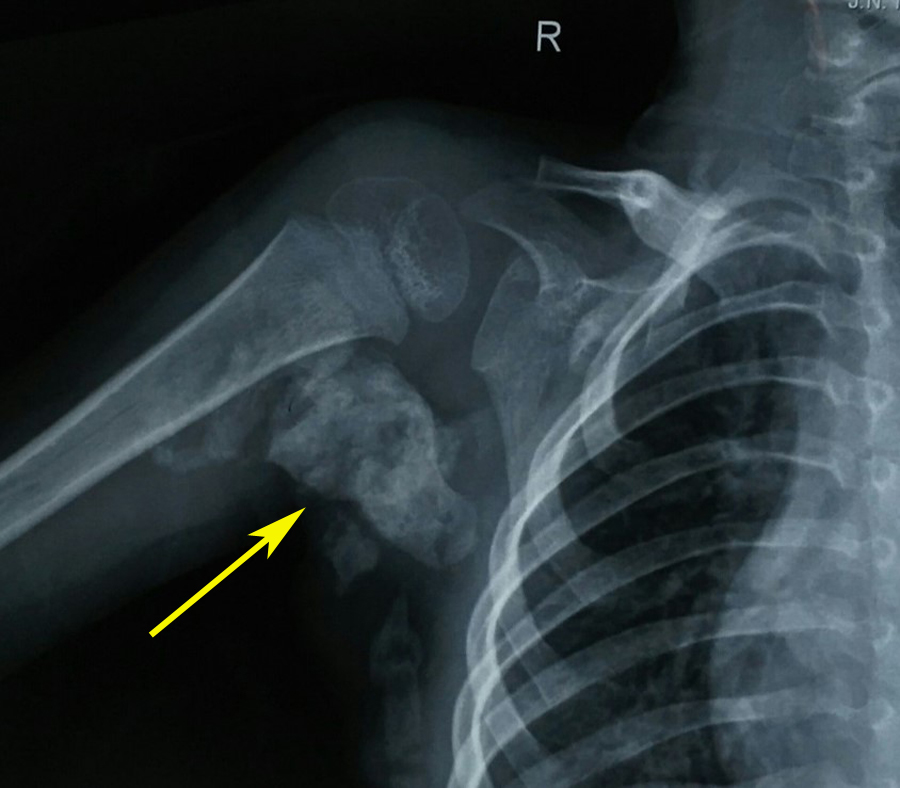 Figure 4 A radiograph of the right shoulder showed variable sized osteomas (arrow) with calcifications between the scapula and the proximal end of the humerus.