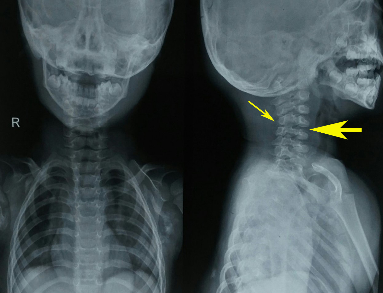 Figure 5 Cervical spine radiograph revealed large posterior elements (thin arrow), narrow vertebral bodies and loss of cervical lordosis (thick arrow).
