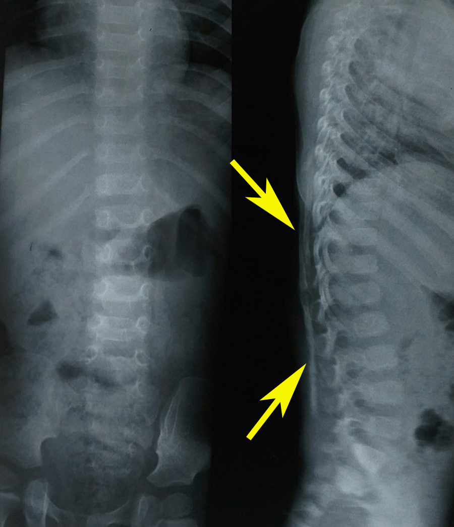 During early course of disease patients of fibrodysplasia ossificans progressiva are often misdiagnosed as having soft tissue sarcoma or aggressive juvenile fibromatosis and hence sometimes undergo invasive procedures (biopsy) that usually lead to the speeding up of disease process.9 Therefore early correct diagnosis of fibrodysplasia ossificans progressiva is necessary to prevent additional iatrogenic insult.6,9 As the disease advances patients become increasingly disabled due to ankylosis of the major joints of axial and appendicular skeleton and are frequently confined to a wheelchair by the age of 30 years.4,9,10 Currently there is no definitive treatment for the disease. A short-term course of high dose steroids, started within the first 24 hours of a flare-up, may help to diminish the intense inflammation and tissue edema seen in the early stages of the disease. Anticipatory management is based on prevention against falls, respiratory deterioration and viral illness. The median life expectancy is nearly 40 years of age. Maximum patients are wheelchair bound by the completion of the second decade of life span and commonly perish of complications of thoracic inefficiency.11 The case study is being presented to highlight the clinical features of fibrodysplasia ossificans progressiva, difficult aspect of diagnosis and management with brief literature review. The patients and their parents were informed that data concerning the case would be submitted for publication, and they consented.