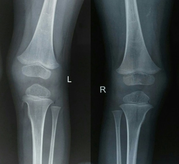 Physical examination revealed bilateral shortening and valgus deformity of the great toes (Figure 1). Multiple swellings of variable size were present on occiput, nape of neck, bilateral scapular area, bilateral axilla and midback. Swellings were non tender, hard, smooth, mobile with well-defined edges and were lying in subcutaneous tissues & muscles. Movements of the neck and bilateral shoulder were decreased (Figure 3). Rest of the joints including bilateral hips, elbows, wrists, knee, and ankle were normal. A radiograph of the right shoulder showed osteomas between the scapula and the proximal end of the humerus (Figure 4). Cervical spine radiographs revealed large posterior elements, narrow vertebral bodies and loss of cervical lordosis (Figure 5). Radiograph of the dorso-lumbar spine revealed large ectopic bone mass bridging the lower dorsal and lumbar spine (Figure 6). Radiograph of the knees revealed the presence of osteochondromas of the proximal medial end of the tibia (Figure 7). Lab findings were normal except for raised ESR (50mm in first hour) & liver enzymes were mildly raised. Patient was diagnosed as a case of FOP on the basis of clinico-radiological examinations. Biopsy was not done because of the fear of flaring up of the disease. Oral prednisolone was given in a dose of 2mg/kg for 5 days. Acute flare of the disease settled and the patient was discharged with advice of regular follow-ups.