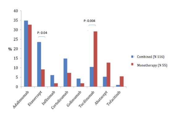 With regards to monotherapy modes of action, in the anti-TNF group 23.8% (95%CI, 16.8-32.1) was used as monotherapy, most frequently adalimumab (63.3%, 95%CI, 42.3-77.6). Amongst biologics with other MOA, 56% (95%CI, 39.7-71.5) were used as monotherapy, most frequently tocilizumab (61.5%, IC95, 40.5-88.2). We could observe that, in general anti-TNF was used in both modalities without any statistically significant differences except for etanercept where a statistical difference was found between both treatment forms. Regarding other MOA in spite of a numeric difference regarding use frequency, which was higher for monotherapy, only tocilizumab presented statistically significant values (Figure 1).