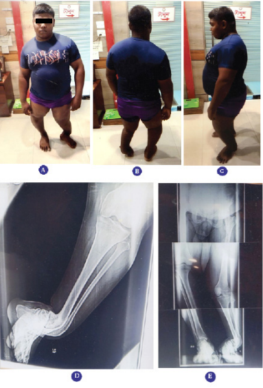A 21 years old boy sustained motor vehicle injury in the left inferior extremity at the age of 4. He was treated at Combined Military Hospital, Dhaka at that time because father is an Army personnel. Now, he was referred to Bari-Ilizarov Orthopaedic Centre for further management, that is for correction of deformity and L. L. D. Plain X-ray and clinical findings showed his right genu varum deformity due to depressed medial tibial plateau and lower (Lt) tibio fibular varus and procurvatum deformity and left knee genu valgum. His father was anxious regarding his deformity correction.4,5 (Figure 1(A-E))