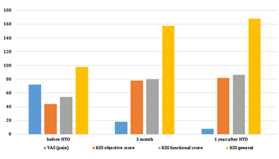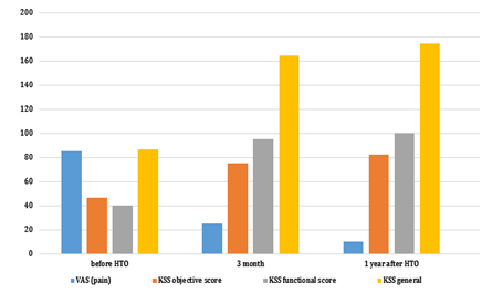 The nearest result was evaluated after 3 months and a year after the operation (Figure 1). Three months after the HTO, the pain decreased from 72.27±11.79 to 17.87±11.04 (from 5 to 50)mm, and after a year the indicator had values of 7.72±6.62 (from 0 to 20)mm. A similar picture was demonstrated by the objective and functional scores of the KSS: before the operation, the objective score was 43.66±11.50 points, and the functional score was 54.39±11.77 points. 3 months after the operation together with the decrease in pain intensity we noted an improvement in the objective score to 77.72±9.48 points, and a functional score to 80.0±12.86 points. A year after the operation these indicators were respectively 81.93±6.65 points and 86.51±10.86 points. Pearson's correlation coefficient demonstrates a strong association of pain reduction in the VAS with an improvement in the functional and objective state of knee joint (-0.62 at p <0.05).