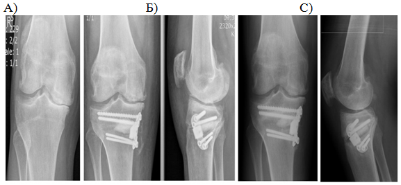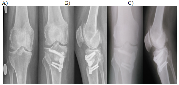 Figure 2 Patient T., 57 years old, 3-rd stage OA of the right knee. Before surgery (A), after 3 months (B), and 1 year (C) after surgery.