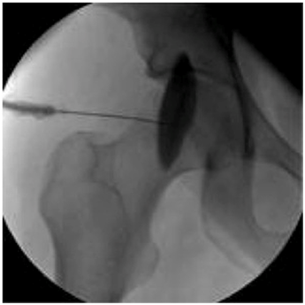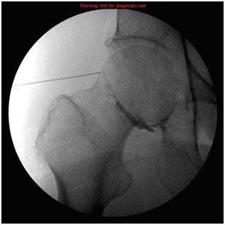 Hip joint is tight joint with negative pressure which means once the hip injected and the joint linked to outside atmosphere the joint will expand and become positively pressurized therefore to make sure the needle in the right place the following parameters should be followed