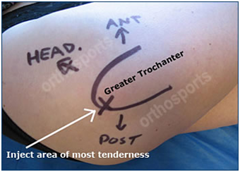 This can be done with ultrasound aid or free hand but the actual site of the injection and the depth of the injection should be respected to achieve effective injection usually posterior upper facet of the greater trochanter is the usual site and the needle should be long enough to reach the bursa near the bone (Figure 2).