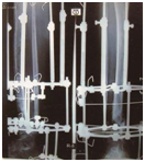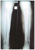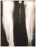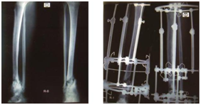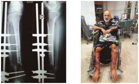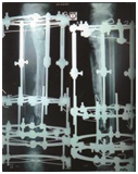 In all 41 patients union were achieved. Union was assessed as per the ASAMI criteria.4 Excellent result were seen in 21 patients (51.21%), good in 12 (29.26%) and fair in 8 (19.51%). Mean Ilizarov fixation for all patients was 366 days (130-250). Mean duration for monofocal compression was 251.2 days (130-320). Mean duration for patients with bifocal simultaneous compression distraction was 340 days (135-360). Mean duration for patients with bone transport was 353 days (321-365). Mean regenerate length of 7 cm (2.5-15.5 cm) was achieved in 15 patients. 16 had shortening ranging from 1 to 2.5 cm; 2 patients had some loss of ankle range of motion (ROM): The mean preoperative valgus deformity of 10.5˚ (9-13.1˚) seen in 8 patients. Mean preoperative varus deformity of 15˚ (10.5-22˚) seen in 9 patients; the mean procurvatum deformity of 15.1˚ (9-20˚) seen in 4 patients. The mean recurvatum deformity of 18˚ (14-25˚) seen in 2 patients (Figure 1 & 2).