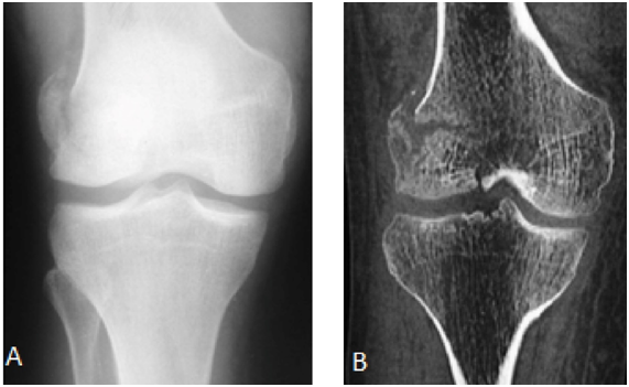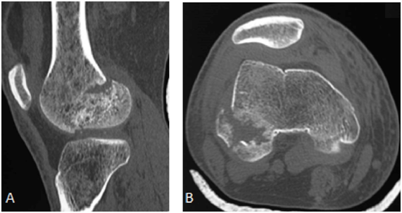 Figure 1 In A, anteroposterior radiograph and CT scan coronal section in B demonstrating fracture of the lateral femoral condyle with a slight misalignment and separation of the fragment.