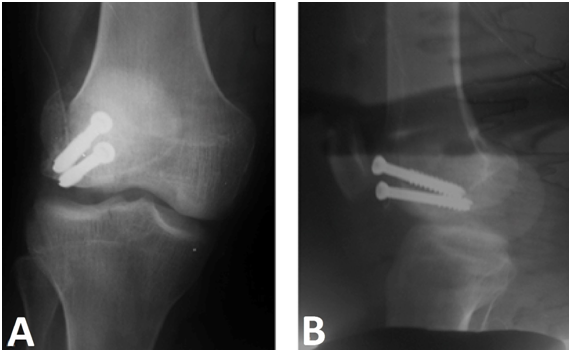 Radiograph of the right knee showed fracture of the posterior aspect of the lateral femoral condyle - Hoffa fracture - type II (Figure 1). CT scan shows fracture of the lateral femoral condyle with a slight misalignment and separation of the fragment, which indicated surgery (Figures 1 & 2). The patient was discharged after surgery, attending since the being accompanied ambulatorially since then (Figure 3).