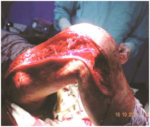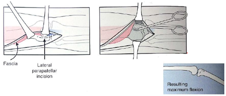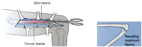 Finally we must release the fascia lata. It should not be separated from the skin to avoid skin necrosis. Transverse incisions at multiple levels can be made across the fascia lata and anterior thigh fascia. At this point, the knee should be able to be flexed fully with the skin, subluxing medially. No attempt should be made to close the knee capsule.