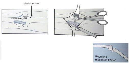 Step-2: MCL and Medial capsular release Medial capsule is cut from a short medial incision; artholysis is performed. MCL is elevated off the tibial distally.