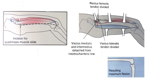 The treatment of knee extension contracture must therefore vary from simple arthroscopy to lyse adhesions to more extensive quadricepsplasty. Quadricepsplasty can be divided into distal and proximal types. Distal quadricepsplasty, such as the Thompson or V-Y types, should never be performed in adults because it leads to permanent knee extension lag. This may occur in children as well, but because the children are growing and retensioning their quadriceps muscle, it may recover. The best way of obtaining knee flexion is the Judet's Quadricepsplasty.1,2 This is a proximally based quadriceps muscle slide that addresses all the elements of the knee contracture. It was popularized by Letournel. The Judet's quadricepsplasty is a stepwise release of the knee and quadriceps muscle. Each successive step determines whether one continues with the next step of the release depending on the amount of knee motion recovered.