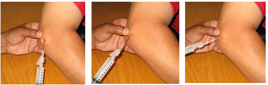 Figure 1A–C Multi-perforate injection technique for injection of corticosteroid and local anesthetic into the anterior inferior aspect of the lateral epicondyle.