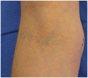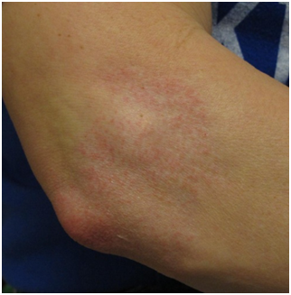 Figure 2 Adverse reaction to steroid injection for tennis elbow, Mild depigmentation and fat atrophy.