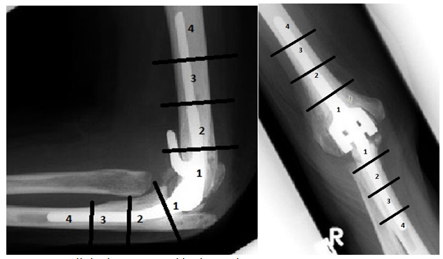 Plain radiographs were obtained for all the patients preoperatively and postoperatively and the severity of preoperative arthritic changes was graded from grade 1 to grade 5 as suggested by Larsen et al.10 The overall satisfaction in surgery results was categorized as follows: 4 – ‘very satisfied’, 3 – ‘satisfied’, 2 – ‘no change’, and 1 – ‘worse’. Pain severity in motion and at rest was assessed using a numeric rating scale from 0 – ‘no pain’ to 10 – ‘extreme pain’.11 Overall discomfort in an affected elbow was rated from 1 – ‘least’ to 4 – ‘worst’. Active elbow range of motion (ROM) was assessed before the surgery and 36 (up to 252) months later by a physiotherapist using a manual goniometer with 5-degree precision. To categorize the radiolucency observed in X-ray images, humerus and ulna areas were divided in four zones (Figure 1).