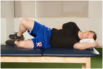 Figure 5 Side-lying Hip Abduction - The therapist ensures that the patient is not compensating with his/her hip flexors and that the hip is in slight extension and external rotation to ensure the gluteals are being targeted.