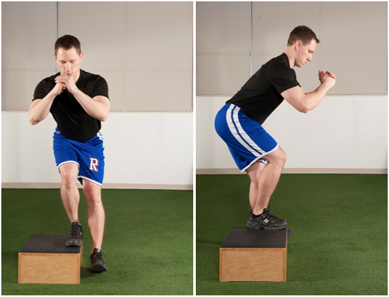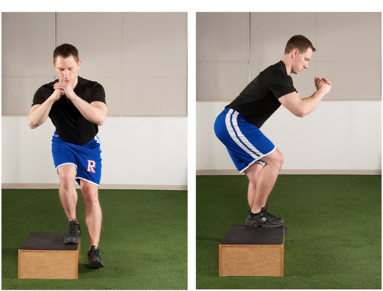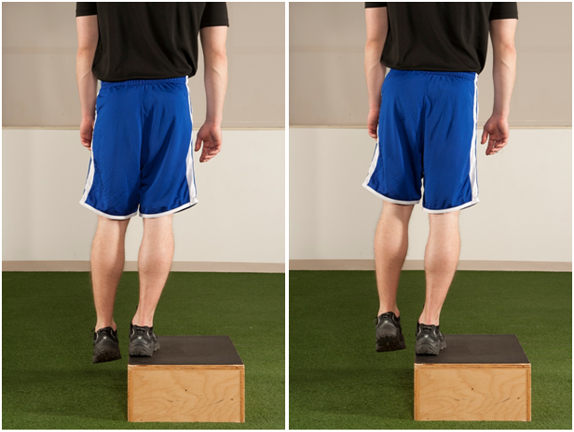 Figure 7 Hip hike. The patient stands on the edge of a box and hikes the hip up on the non-stance limb while focusing on squeezing the gluteal muscles on the stance limb.