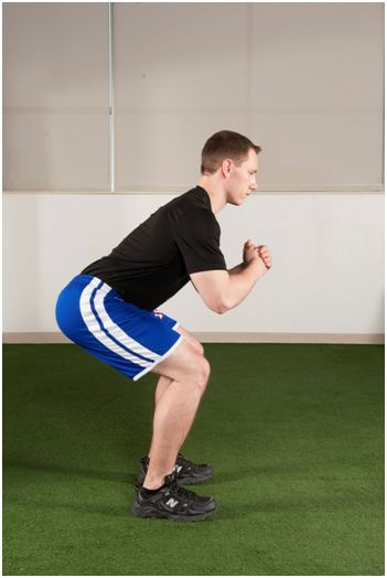 Figure 6 The Body Weight Squat. The patient is cued to keep the knees behind the toes and to maintain the knees in neutral alignment in the frontal plane. Any hip adduction, internal rotation, or dynamic knee valgus is discouraged. Mirror feedback, a resistance band theraband placed around the knees, and other tactile cues are utilized to promote this movement pattern.