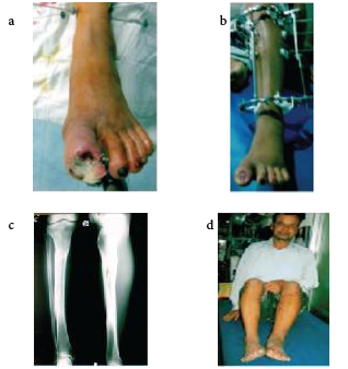 In view of the above symptoms Ilizarov external fixator was applied in the right or left leg with vertical corticotomy of the proximal and middle 1/3 of the tibia, distraction continued for 3 weeks. Ilizarov external fixator was removal after 8-10 weeks depending upon the cases. After removal of Ilizarov apparatus plaster cast was applied for 3 weeks. The treatment of TAO and limb salvage was successful by this method. Ilizarov external fixator in the proximal half of the tibia followed by distraction of this procedure creates neovascularization in blood circulation of the lower limbs, which relieves the patient’s pain and ischaemic symptoms.5-7