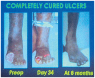 The surgical procedure was performed at the antero-lateral part of the tibia approximately 12 cm long and 2 cm wide. The Ilizarov device consists of 2 rings and 4-6 olive wires linked to a lateral plate. Osteotomy done above and below and below the olive wires meticulously. The tibial section has been moved approx. 1 mm/day for 3 weeks.1-4 The clinical status improved within a few weeks. Cure of trophic ulcers observed and no more pain. Arteriogram on the 2nd month improved circulatory result.
