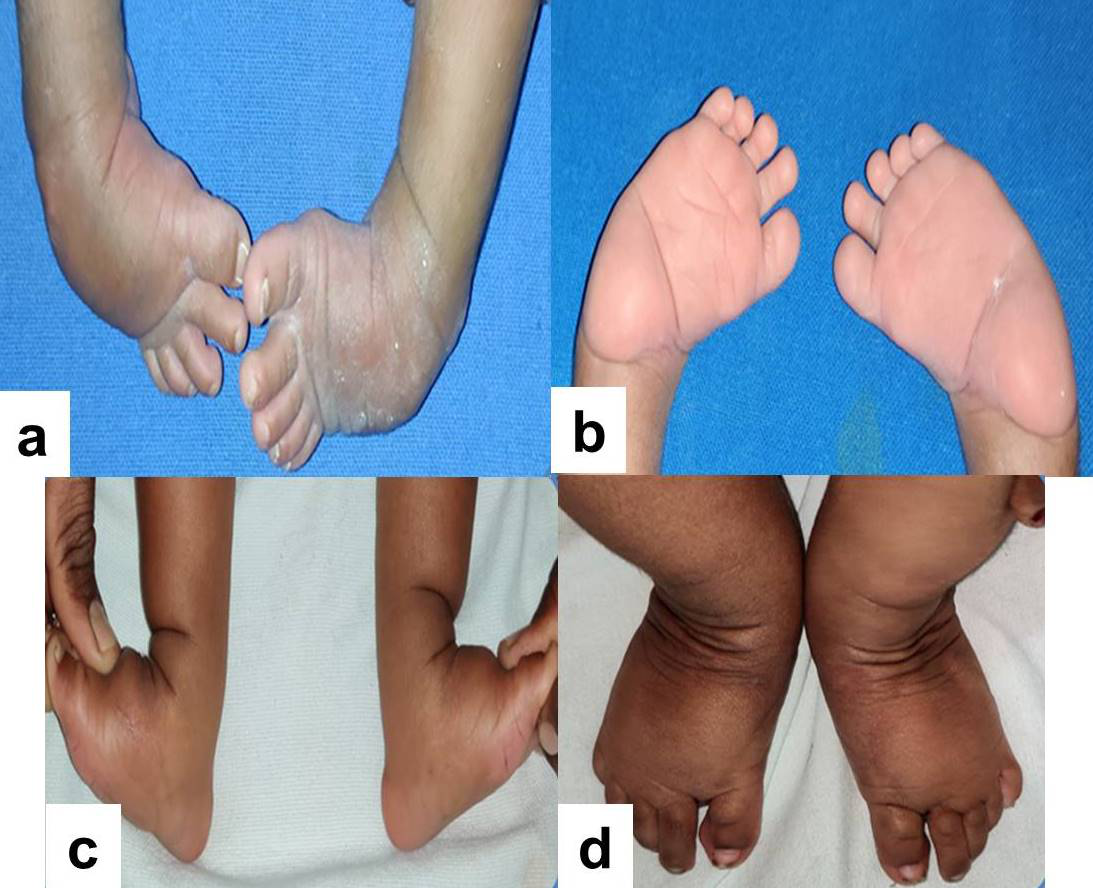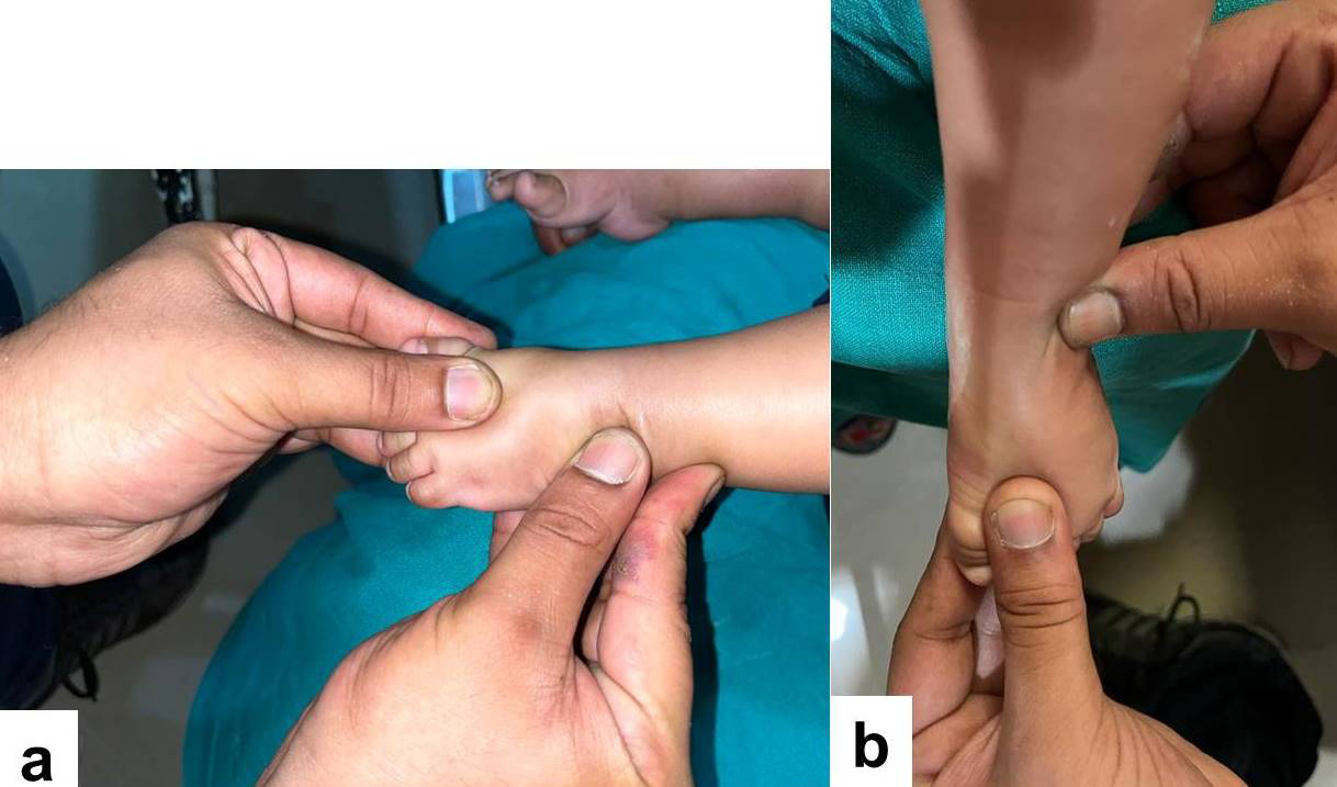 Casting in complex clubfoot was done as per the Modified Ponseti method.6 The modification from the classical method was firstly to correct the mid-foot inversion and heel varus, followed by correction of hyperflexion of metatarsals and the rigid equinus. For correction of the mid-foot inversion and heel varus, the thumb is placed over the lateral aspect of the talar head, and the index finger of the ipsilateral hand is placed over the posterior aspect of the lateral malleolus. The forefoot is abducted with the other hand while counter-pressure on the lateral aspect of the talar head and posterior aspect of the lateral malleolus is upheld (Figure 1). It should be kept in mind never to abduct the forefoot beyond 30° to 40°. If one tries to gain more abduction, it will lead to further flexion of metatarsals and toes as well as excessive abduction of the metatarsals at the tarso-metatarsal joint (Lisfranc articulation). This is owing to short and taut deep plantar muscles. The subsequent plaster casts were applied till abduction of 30° was achieved and hind-foot varus was corrected. Second modification was to correct the hyperflexion of metatarsals and the rigid equinus concurrently. For achieving this, both the index fingers are positioned on either side of the head of the talus, and both the thumbs are positioned on the sole of the foot on the heads of first and fifth metatarsals. The hyperflexed metatarsals are pushed in dorsiflexion concurrently pressure being applied on both the metatarsal heads to produce the extension of all the metatarsals. While doing this maneuver the knee is steadied in flexion. The outcome of the technique will position the forefoot in mild abduction and heel in mild valgus. Care should be taken not to produce a rocker bottom foot deformity. After correction of the hyperflexed metatarsals and the equinus, the well molded above knee plaster cast is applied in about 110⁰ to 120⁰ flexion at the knee. Once 30⁰ to 40⁰ of abduction have been accomplished, and the hyperflexion of metatarsals has been corrected, but the equinus is still persisting, tenotomy can be performed in complex clubfeet. The tenotomy should be done 1.5 cm above the heel crease to avoid injury to the calcaneal tuberosity. If desired correction was achieved then a plaster cast was given in maximum correction for 3 weeks else the post-tenotomy cast is changed every 4 to 5 days so as to achieve at least 5⁰ of dorsiflexion and 40⁰ of abduction. Thereafter, SFAB (Steenbeek Foot Abduction Brace) with 40° External rotation and 15° dorsiflexion was given to all the patients 3 weeks after tenotomy to maintain correction. It was applied 23 hours a day for first 3 months and then at night/nap time for another 3 years. The brace used in modified technique should only have an abduction of about 40°, when compared to usual 70° in idiopathic variety of clubfoot. However, the timings and duration of bracing protocol is essentially the same. Figure 2 & 3 depicting the pre-treatment and post-treatment clinical photograph of the two patients.